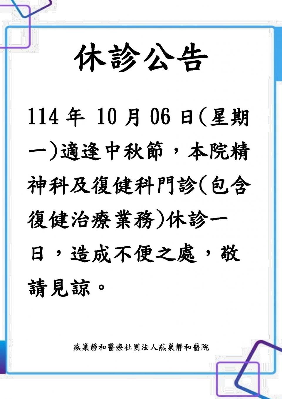 114年 10月06日(星期一)適逢中秋節,本院精神科及復健科門診(包含復健治療業務)休診一日,造成不便之處,敬請見諒。