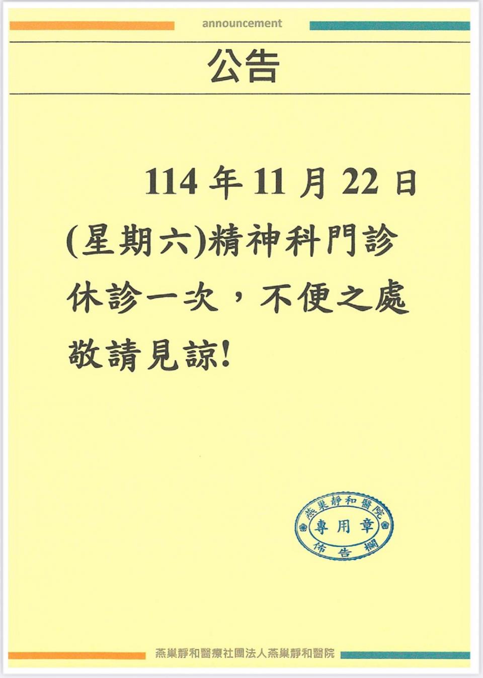 休診公告-114年11月22日(星期六)精神科門診休診