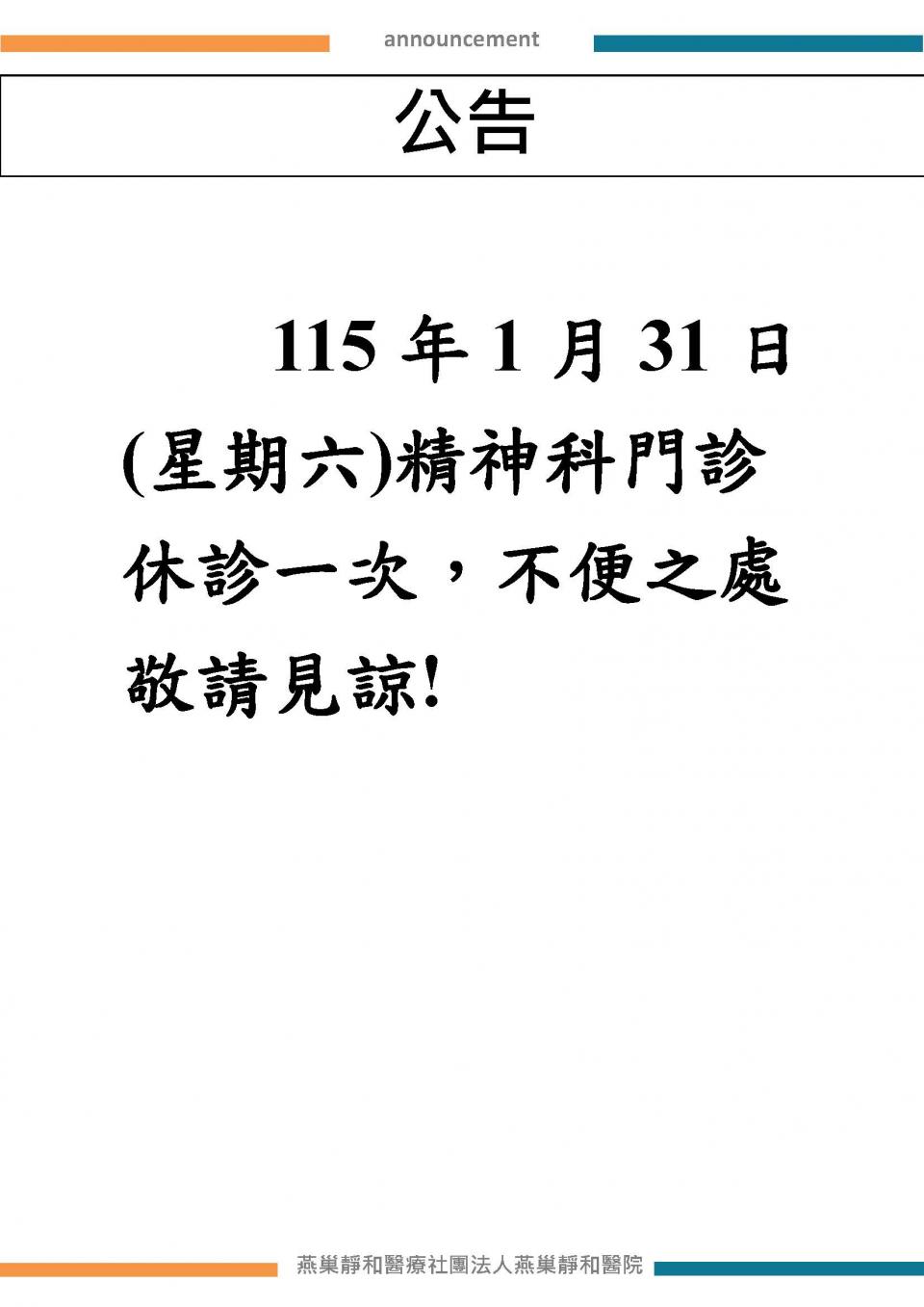 休診公告-115年1月31日(星期六)精神科門診休診一次,不便之處敬請見諒!